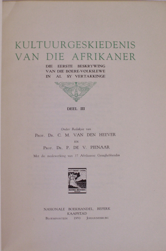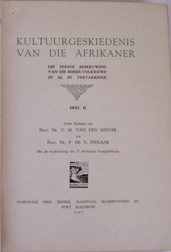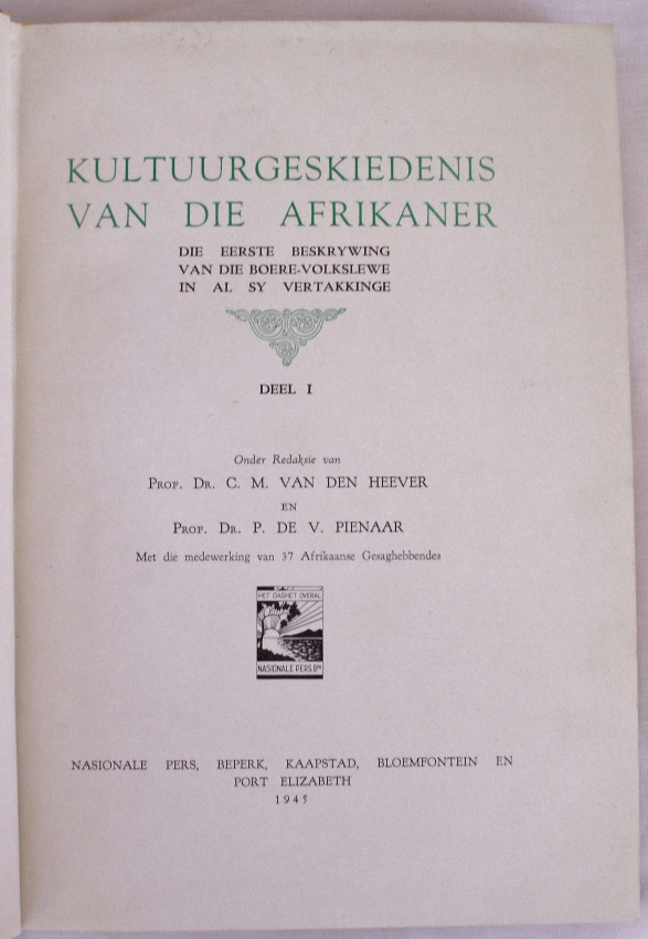 Kultuurgeskiedenis Van Die Afrikaner. Volumes 1, 2 and 3, Published By Nasionale Pers, BPK. 1945, 1947 And 1950. Cape Town. Edited By Prof. Dr. C. M. Van Den Heever And Prof. Dr. P. De V. Pienaar. ( Afrikaans. )