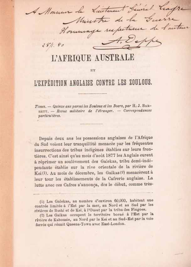 The presentation inscription reads, 'A Monsieur le Lieutenant Général Liagre Ministre de la Guerre, Homage respecteuse de l'auteur, A. Deppe, 28/1/80'.