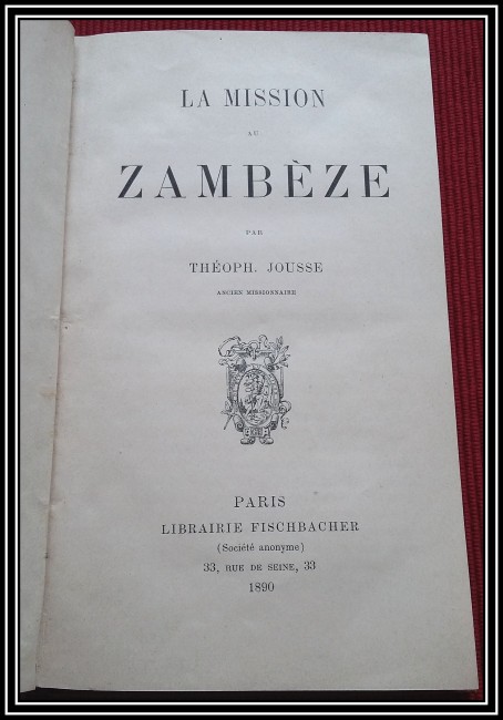 "La mission au Zambeze, par Theophile JOUSSE, ancien missionnaire"; Sheepskin hardcovers; Collation complete - 181 pages; Text in French.