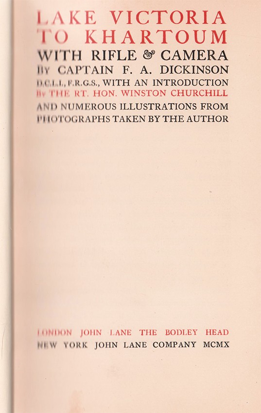 Czech (Dr. Kenneth) An Annotated Bibliography of African Big Game Hunting Books 1785-1999 page 81: Dickinson provides details of where to hunt the major game of the Uganda southern Sudan region, from the highlands to the Sudd of the Nile. He served as Winston Churchill’s escort from Lake Victoria to Gondokoro and includes two chapters on elephant hunting.