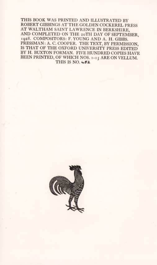 The colophon reads: This book was printed and illustrated by Robert Gibbings at the Golden Cockerel Press at Waltham Saint Lawrence in Berkshire, and completed on the 20th day of September, 1928. Compositors: F. Young and A.H. Gibbs. Pressman: A.C. Cooper. The test, by permission, is that of the Oxford University Press, edited by H. Buxton Forman. Five hundred copies have been printed of which nos. 1-15 are on vellum. This is no. 452