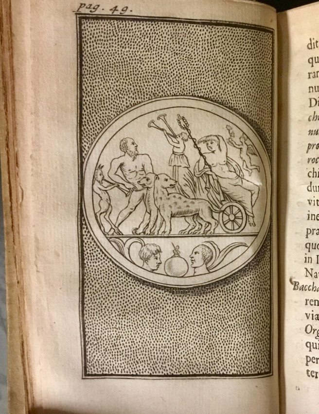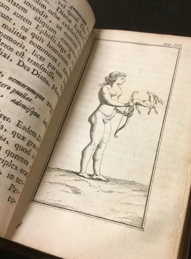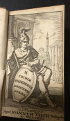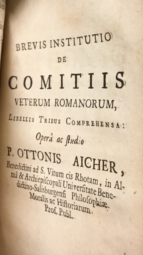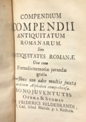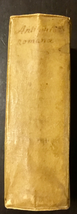 Contemporary full vellum with handwritten title on spine; covers darkened. Engraved title page and twenty-one copperplate engravings. Published with author's “Compendium compendii Antiquitatum Romanarun” (60 p.), and “Brevis Institutio de Comitiis Veterum Romanorum, Libellis Tribus Comprehensa” by Otto Aicher, each with separate pagination. Today we would call such a work a “Classical Dictionary.” Alphabetically arranged and quoting a wide variety of authors, it explains terms, words, names and historical events necessary for the understanding of Latin literature and Roman history.