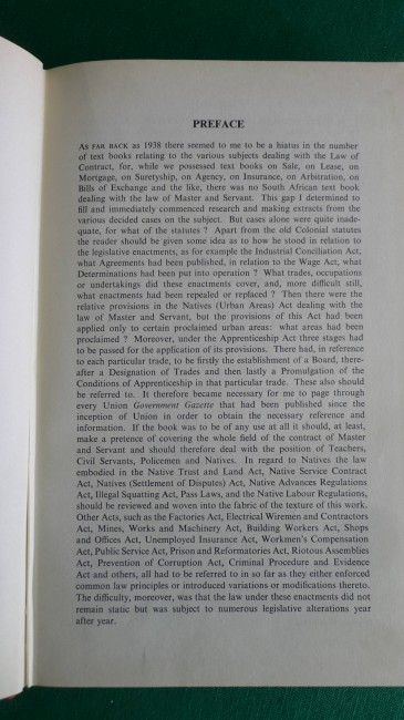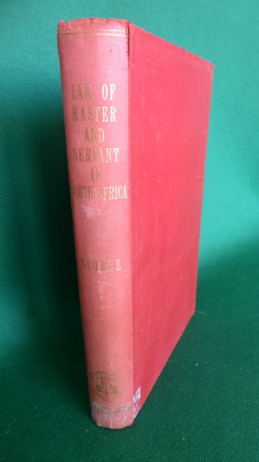 The red cloth-boards are frayed at the spine extremities and rubbed at the corners, and the gilt-lettered spine is faded. There are law office stamps on the endpapers. The contents - liv + 409 pp of text, schedules and index - are unmarked and undiscoloured, making this a good reference copy of the first comprehensive South African book of the law of master and servant, the author's work on which dated back to 1938.