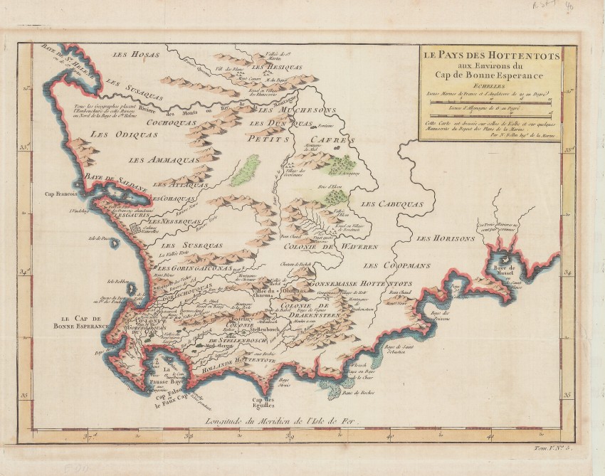 This French map is well known for its title that assigns the territory to the ‘Hottentots’; it reflects European understanding of the location of various indigenous groups that lived in the south-western Cape.