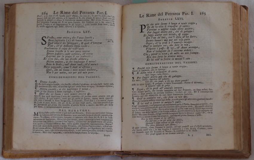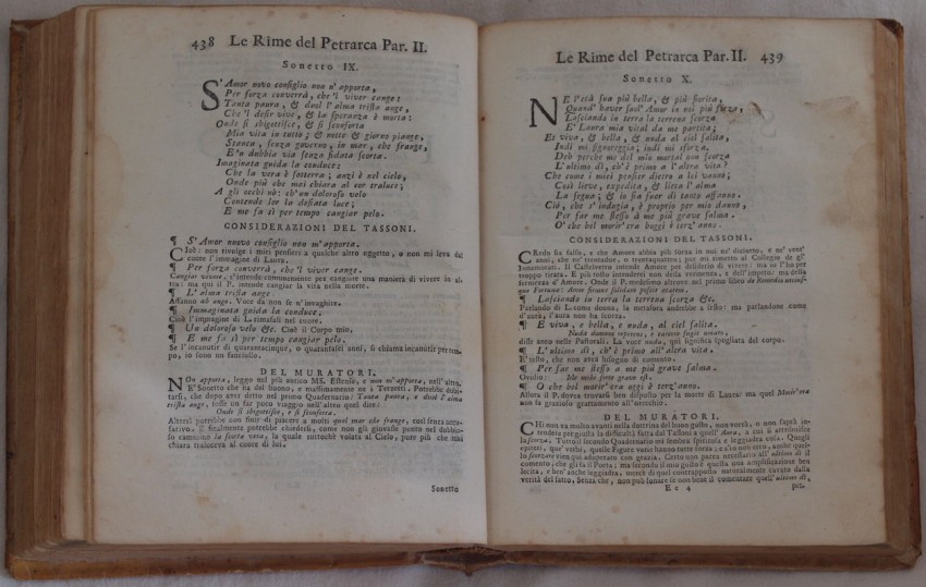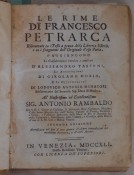 Venetian edition of 1741 of the famous rhymes by Francesco Petrarca (1304-1374). Considerations reviewed by Alessandro Tassoni (1565-1635), notes by Girolamo Muzio and observations by Lodovico Antonio Muratori. Prefationand life of Petrarca by Muratori, then the rhymes. At the end fragments of PetrarcaTrionfo d'amore, Trionfo della castità, Trionfo della morte, Trionfo della fama, Trionfo del tempo, Tionfo della Divinità, alcune composizioni del Petrarca (Sonetti, un capitolo, Stramazzo da Perugia al Petrarca, Geri Gianfigliacci a P. De Dondi, Benucci, Giacomo Colonna, Giacopo de Garatori da ImolaAntonio da Ferrara, Canzone di Guido Cavalcanti, Cino da Pistoia etc...
