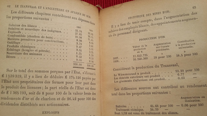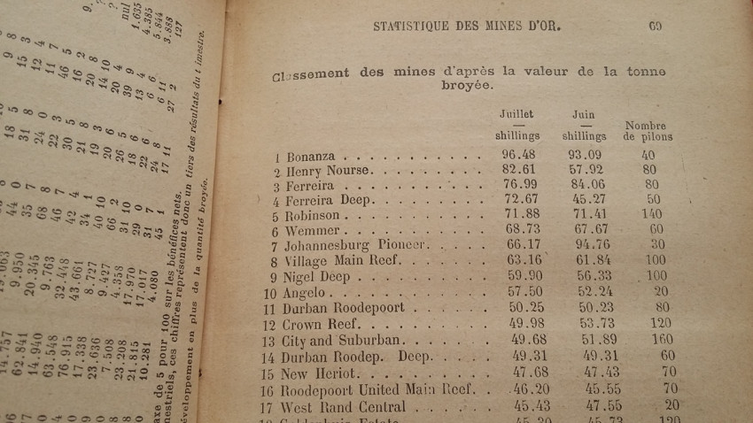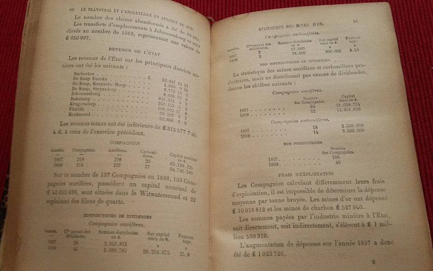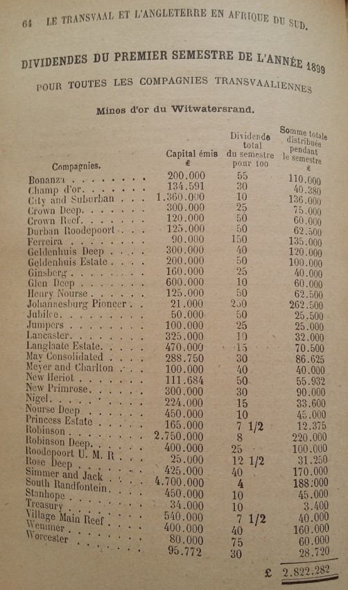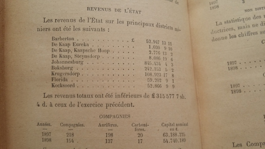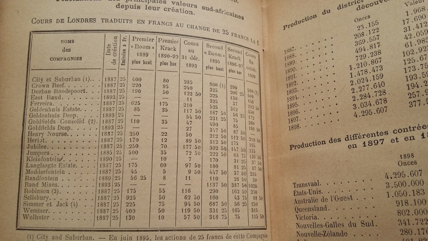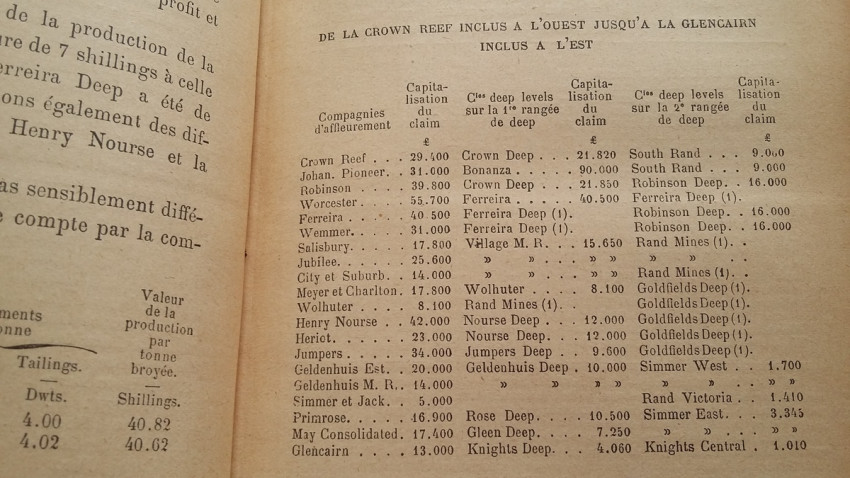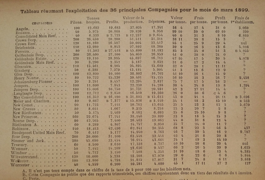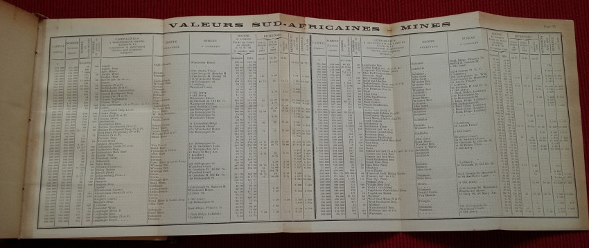 A two folding tables shows most important facts about the values of all South African and Rhodesian Mines, chartered companies, corporations, syndicates and unions, the values of land and diamondiferous lands (including their names and owners, their capital in British pounds, number of issued actions, dividends, number of mineral claims, number of active grounds, productivity in ounces on August 1899 and their benefits in British pounds on August 1899).