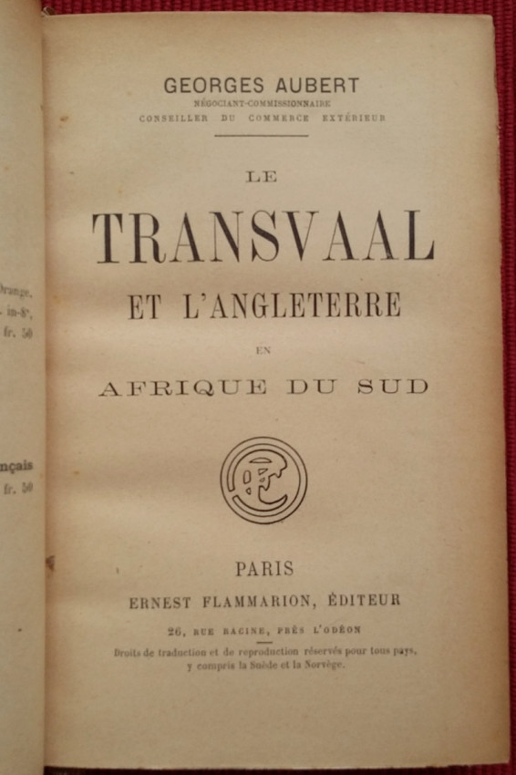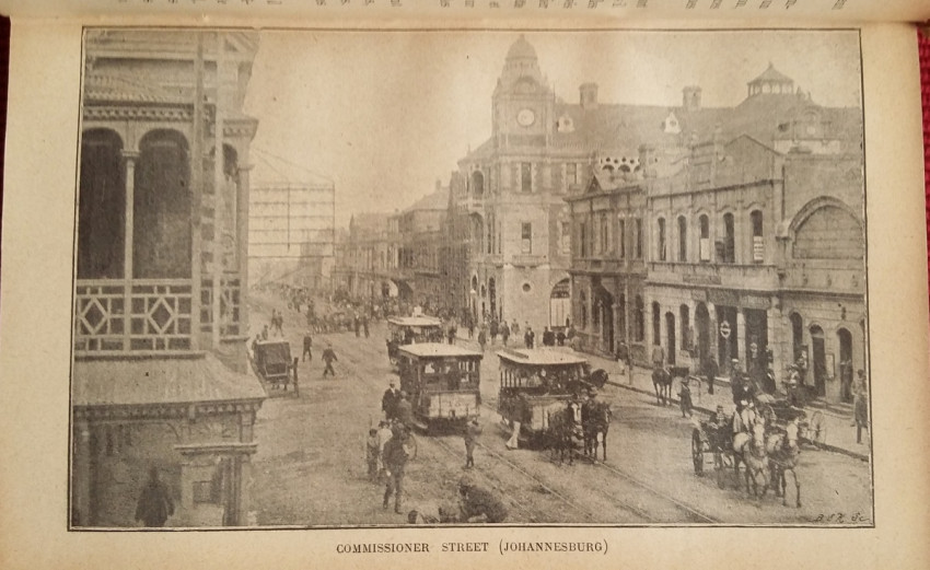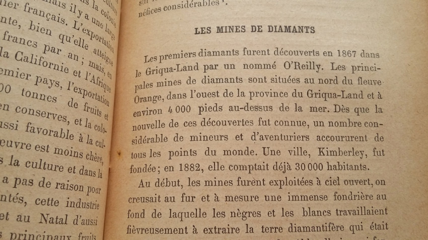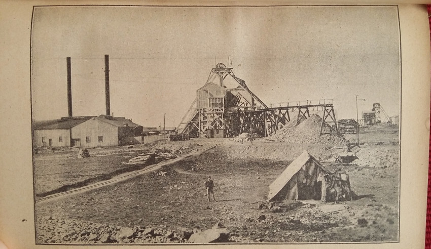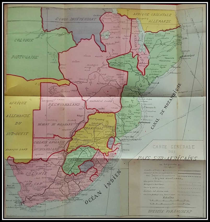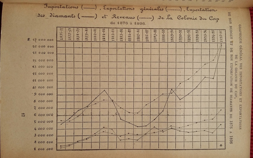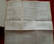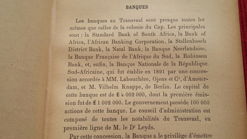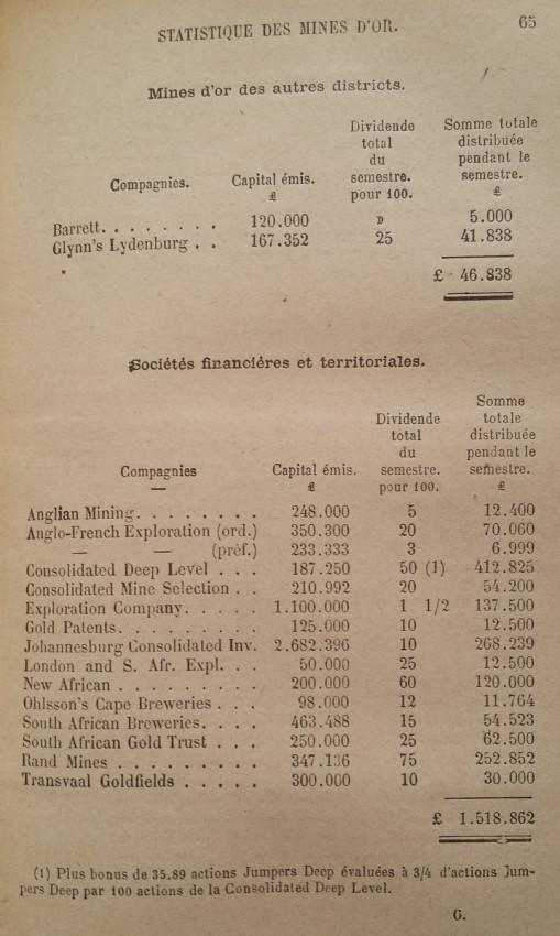 A two folding tables shows most important facts about the values of all South African and Rhodesian Mines, chartered companies, corporations, syndicates and unions, the values of land and diamondiferous lands (including their names and owners, their capital in British pounds, number of issued actions, dividends, number of mineral claims, number of active grounds, productivity in ounces on August 1899 and their benefits in British pounds on August 1899).