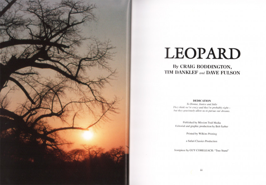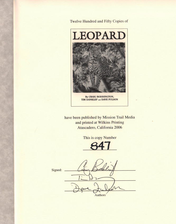 First edition: vii, 196 pages, colour frontispiece, colour map, profusely illustrated with colour photographs, half title page, printed on coated paper, full blue faux suede covers with gilt title on the upper cover and spine, gilt vignette of a leopard on the upper cover, a fine copy housed in blue cloth covered solander box with the same decoration as the cover.
