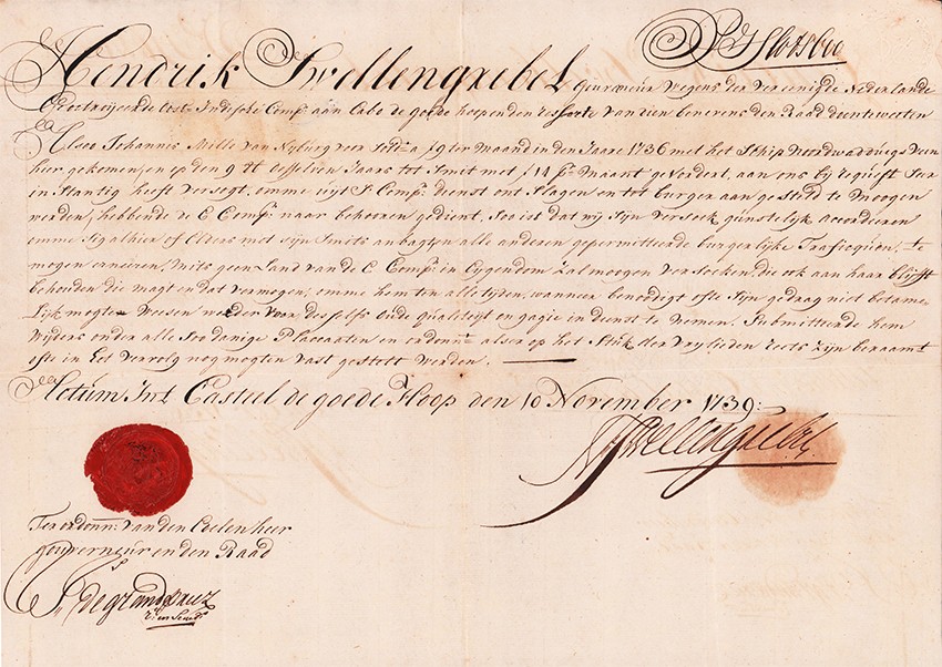 The document grants Johannes Nille from Nyburg, his freedom. He arrived in the Cape on the ship Noordwadd, in 1736 and was paid 14 guilders a month, employed by the DEIC. He was released from Company employment and given the status of burgher by the signing of this document at the Castle of Good Hope on 10 November 1739.