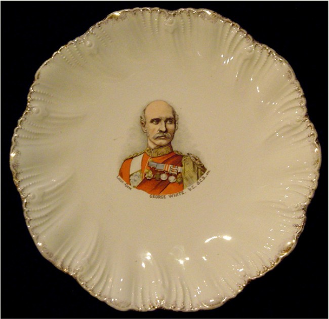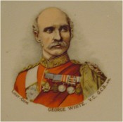 White plate with gilt border, portrait of General White at the centre titled beneath, "Lieut.- Gene. George White, V.C., G.C.B., Etc." no maker's name or date.