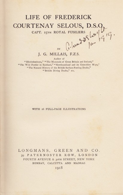 Czech: An annotated Bibliography of African Big Game hunting Books, 1785 to 1950, page 115, ‘Written as a tribute to Selous, who was killed in action against German forces in East Africa during the Great War, Millais includes numerous passages from his subject’s books and articles, recounting big-game hunting adventures in Africa and other international locales.’