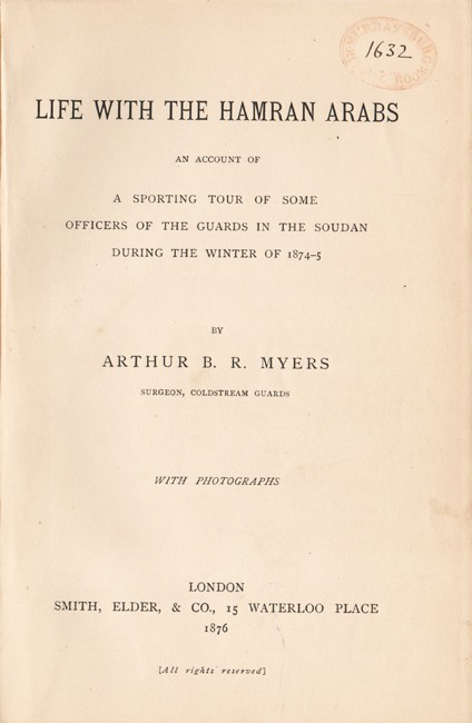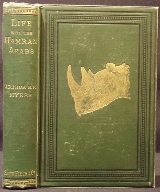 Czech (Dr Kenneth) An annotated Bibliography of African Big Game hunting Books, 1785 to 1950, page, 206, 'A surgeon in the Coldstream Guards, Myers embarked on a sporting expedition to the lands of the Hamrans, renowned as elephant hunters. In the remote regions beyond the town of Kassala, his hunting party encountered lion and elephant with Myers trying to bag the latter by moonlight. Crossing the Setit River, they enjoyed considerable sport after rhinoceros, buffalo, hippopotamus and numerous engagements with lions. They also bagged bushbuck, kudu, dikdik and other plains game. This tile also features mounted photographs by Rowland Ward.'