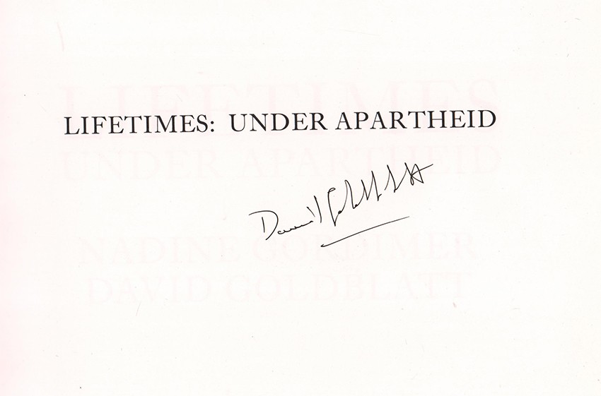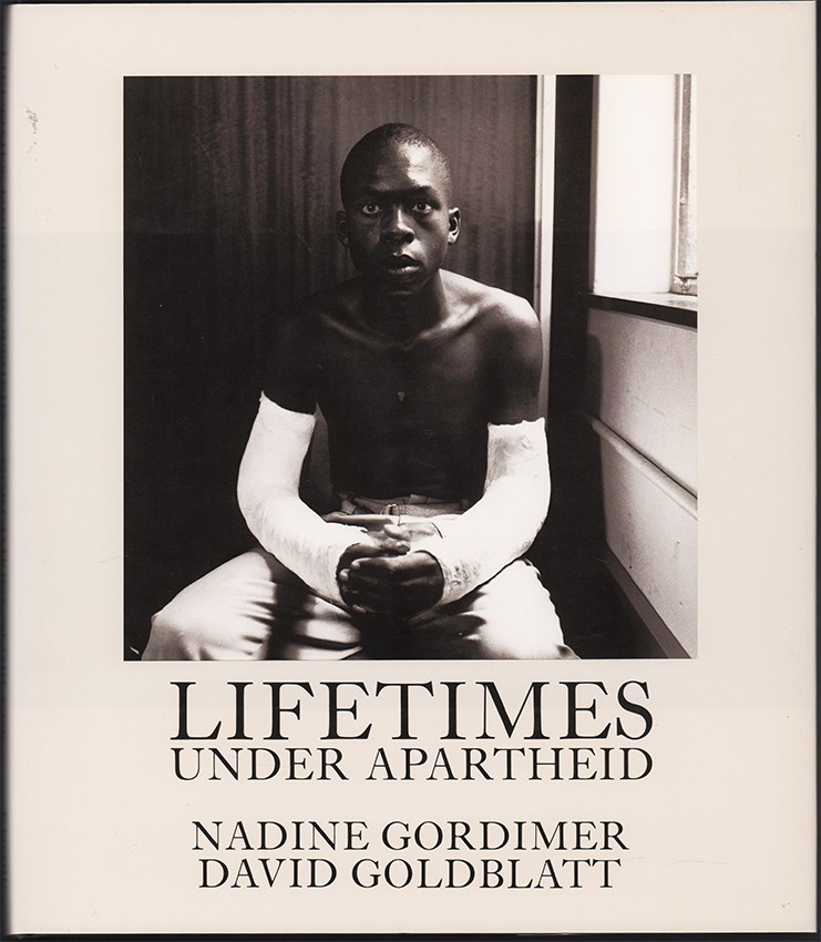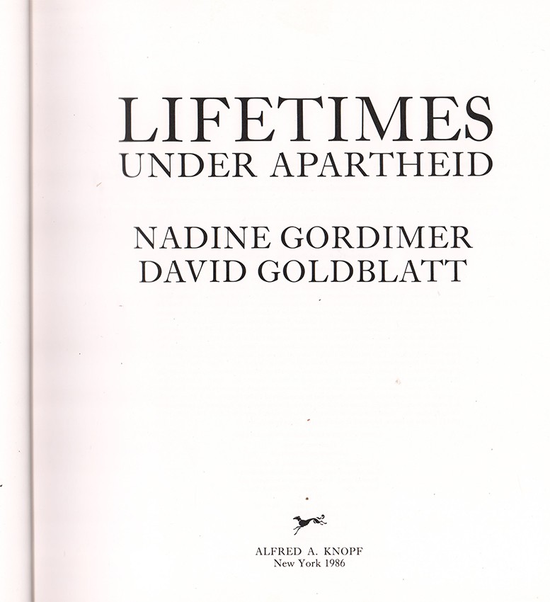 Excerpt on a page (unpaginated) before page 1 by Nadine Gordimer and David Goldblatt reads: We have come a long way, with our country: a lifetime. Both of us were born white and slowly learned to leave that fatal isolation through the lessons of our work: the images and words. We believe that what white South Africans have done to black South Africans seeps like an indelible stain through fiction and photographs.