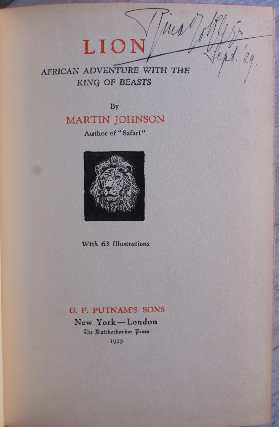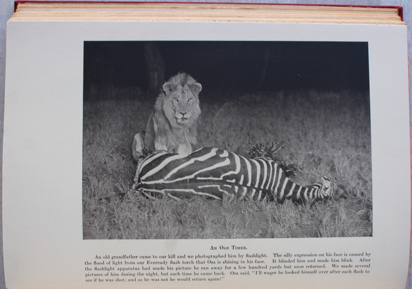 Czech (Dr. Kenneth) An Annotated Bibliography of African Big Game Hunting Books 1785 – 1999, page 144: A popular title of its day that went through many printings. Martin and wife, Osa, followed, photographed and eventually bagged a few of the big cats in East Africa. The first chapter, on the dangers of lion hunting is perhaps the best.