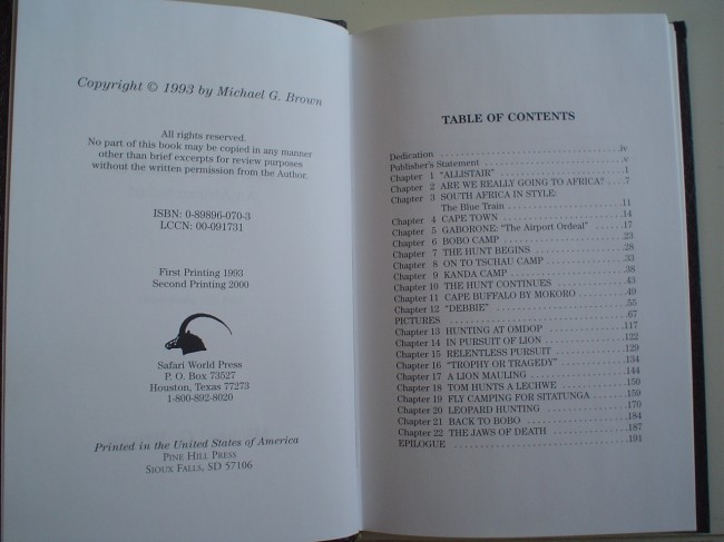 Lion Charge: Second print 2000 in leather and in splendid condition. Published by Safari World Press in Texas. 189 pages.