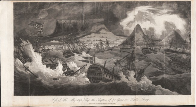 Aquatint print of the wrecking of the Sceptre in a storm in Table Bay.