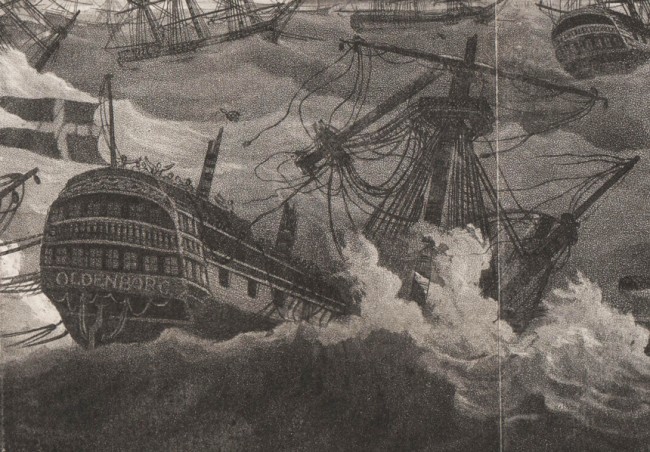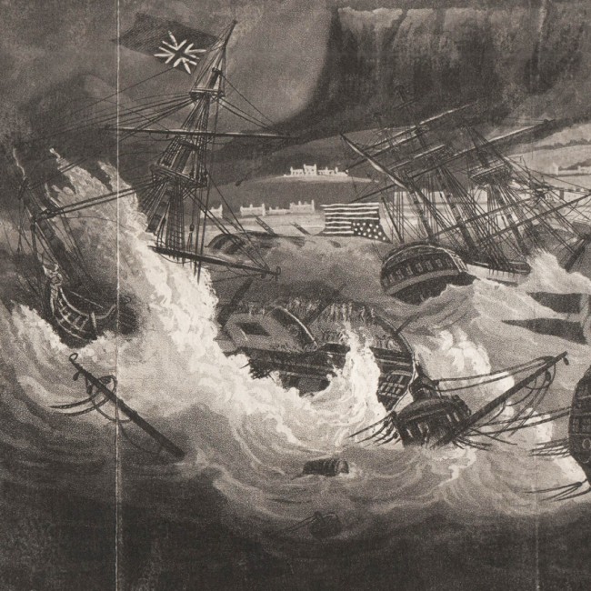 With three folds. This print is the frontispiece from The Mariner's Chronicle: Being a Collection of the Most Interesting Narratives of Shipwrecks, Fires, Famines, and Other Calamities Incident to a Life of Maritime Enterprise, Volume 1.