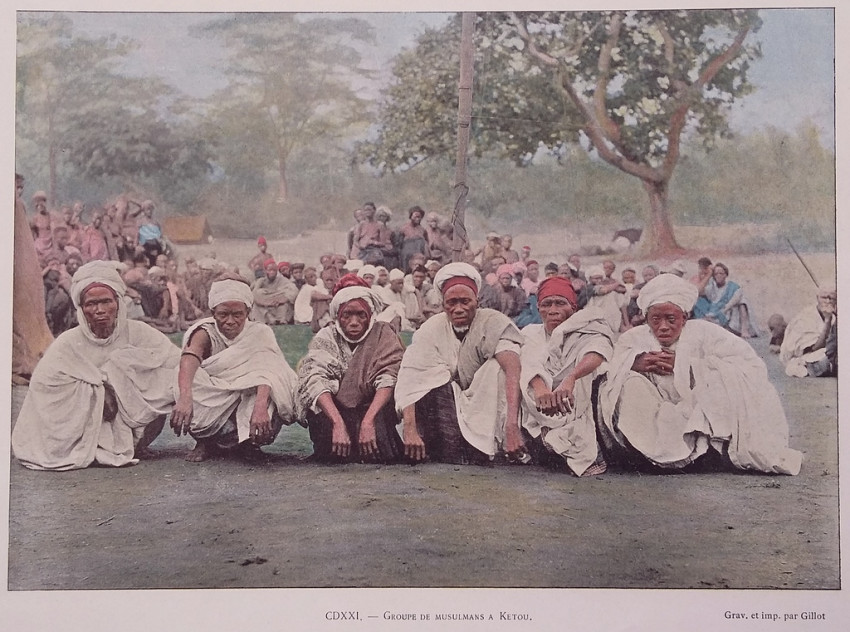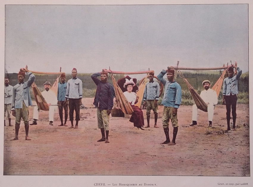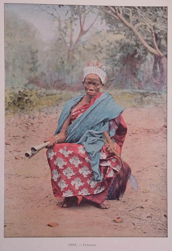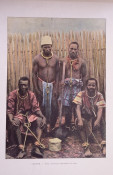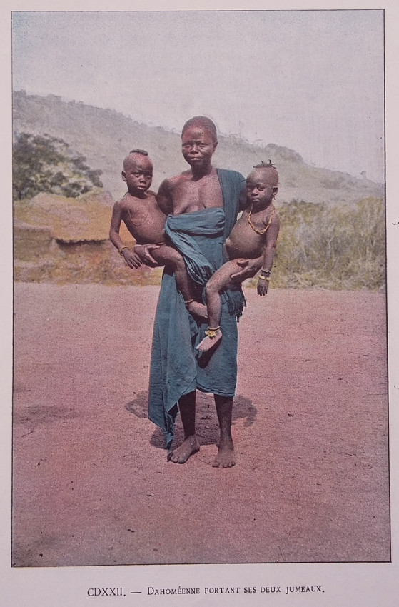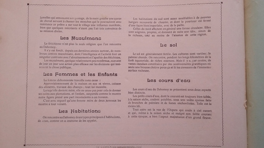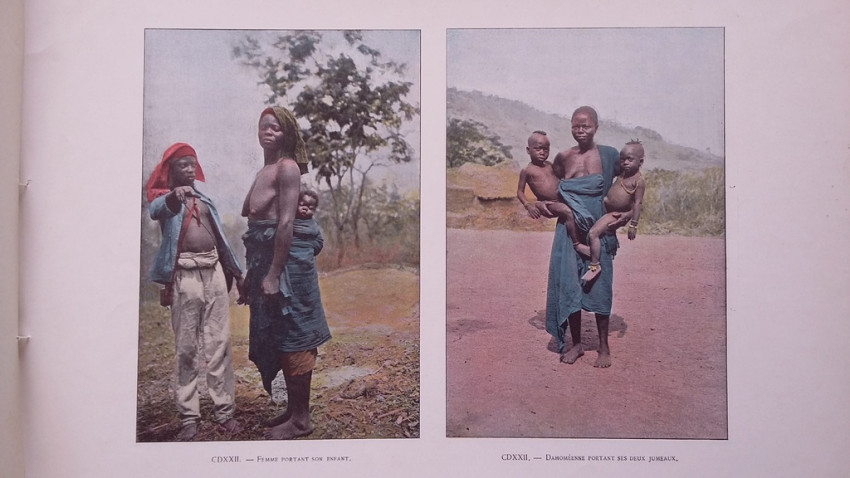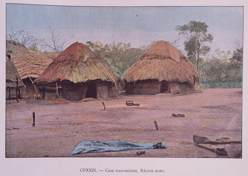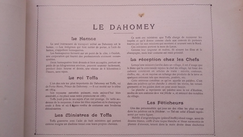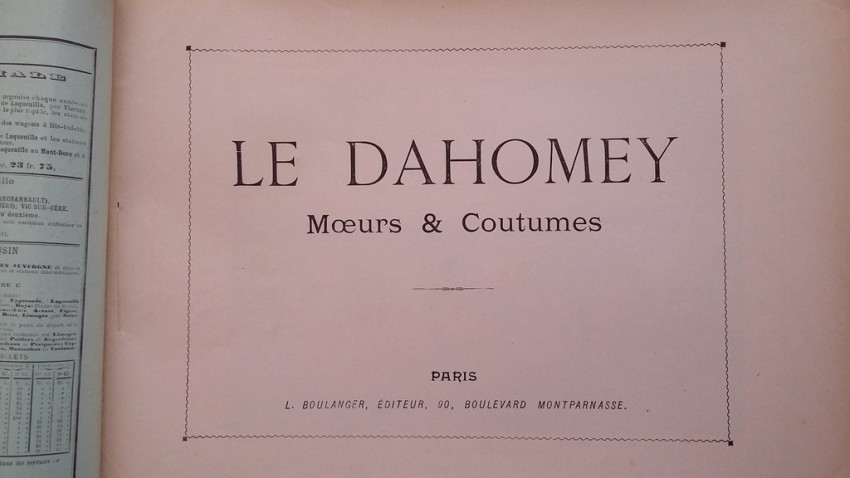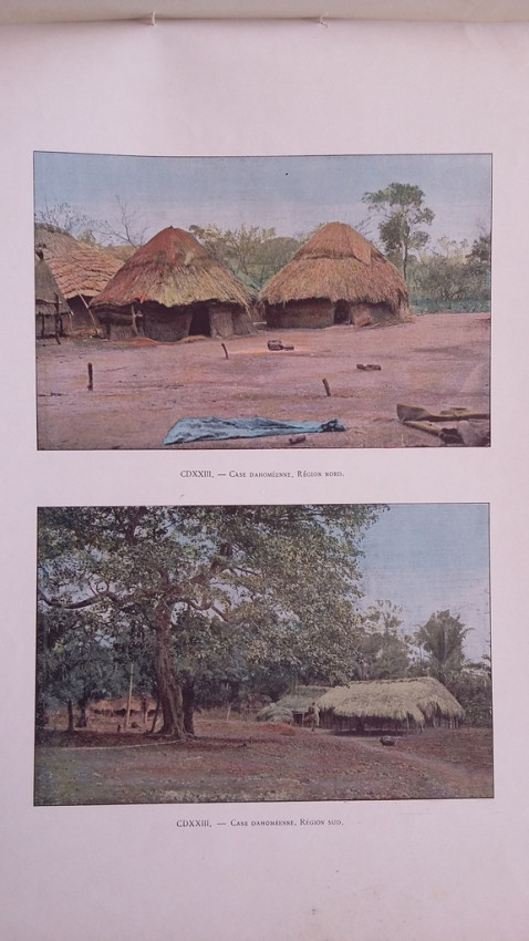 1) "Autour du Monde. Le Dahomey: Moeurs & Coutumes"; Paper wrappers; Collation complete - Title page, 8 photochrome plates with 11 photochromies and 2 table pages with detailed explanation of each plate; Text in French; Paperback showing signs of use with partly spine tear, some yellowing/browning and discoloration. Content bright and clean, no foxing throughout. A sound copy.