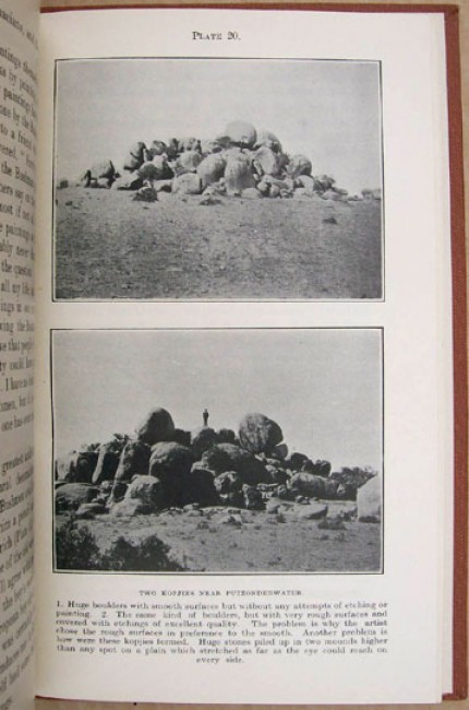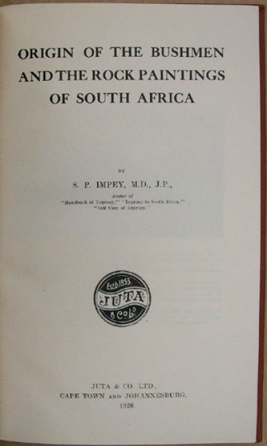 The third book is "Origin of the Bushmen and the Rock Paintings of South Africa", by S.P. Impey. Original brown cloth boards with gilt titling on the spine. iv prelims, 102 pages, 21 black and white plates. Published by Juta & Co., Cape Town, in 1926. There is a pen name on the front paste down and aside from this - a clean and attractive item.