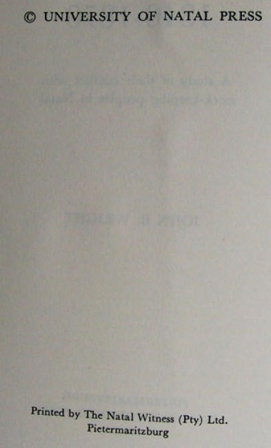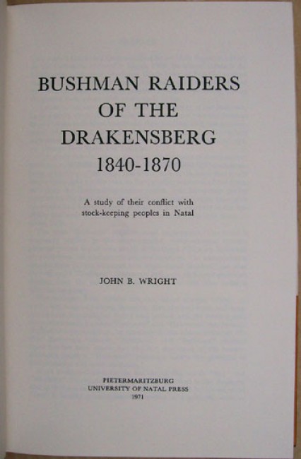 The second title is "Bushman Raiders of the Drakensberg 1840 - 1870. A study of their conflict with stock-keeping peoples in Natal", by John B. Wright. Original dust jacket. Original brown rexine boards with gilt titling on the spine. ix prelims, 235 pages, fold out map at the rear, profusely illustrated. Published by the University of Natal Press, Pietermaritzburg, 1971. The dust jacket has some soiling and its underside is browned.