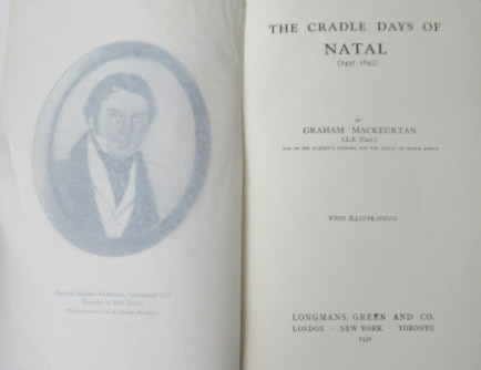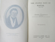 The Cradle Days of Natal 1497-1845. By Graham Mackeurtan. Puplished by Longmans, Green and Co, London. 1930. 22.5 X 15cm. First Edition. Blue boards- Half Title, Frontispiece,Tissue Guard and Title, Dedication, Preface, Contents, List of Illustrations. xii plus 348 pages text with suporting illustrations.