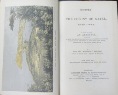 History of the Colony of Natal. By Rev.William C.Holden. Published by C Struik Cape Town. 1963. Volume 4 in Africana Collectanea Series. Numbered 367 of 750 copies.22 x 14.5cm Red-Brown boards- Half Title, Title, Introduction, Acknowledgement, Illustrations, Colour Illustration, Title, Preface by the Editor, Contents, Folding Map. viii plus 483 pages text, with folding maps and illustrations + 12 pages.