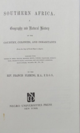 Southern Africa. A Geography and Natural History of the Country, Colonies, and Inhabitants, customs, traditions, superstitions,religious usages, languages, past and present conditions, manufactures, weapons, etc, etc. By Rev. Francis Fleming. Published by Negro Universities Press, New York, Reprinted. 1969. 22 X 14.5cm. Brown boards. Title, Folding Map, Dedications, Errata, Contents, Engravings, Preface, Folding Map. xi plus 497 pages text with supporting illustrations.