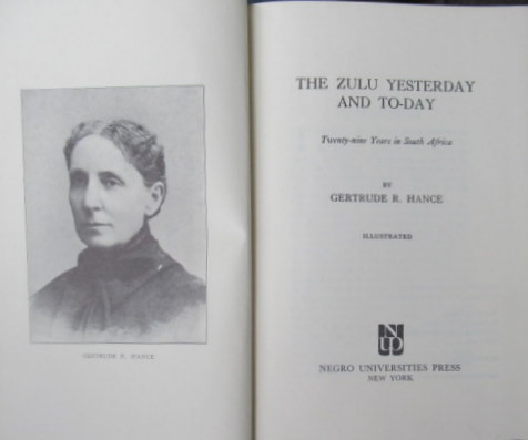 The Zulu Yesterday and To-Day- Twenty-nine Years in South Africa. By Gertrude R. Hance. Published by Negro Universities Press, New York, Reprinted. 1969. 22 X 14.5cm. Brown boards. Half Title, Frontispiece, Title, Introduction, Contents, Preface. 274 pages text with supporting illustrations.