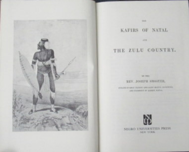 The Kafirs of Natal and The Zulu Country. By Rev. Joseph Shooter. Published by Negro Universities Press, New York. Reprinted 1969. 22 X 14.5cm. Brown boards. Half Title, Frontispiece, Title. Preface, Illustrations, Map. x plus 403 pages text, some illustrations to text.