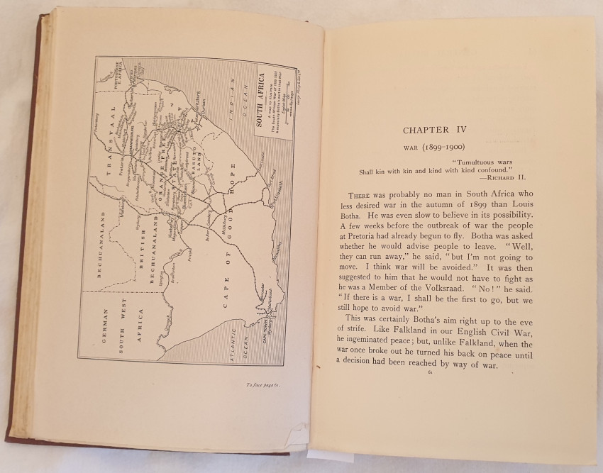 In 8. [Cm 23x15,5 (9.3x6.1 inch.)]. Pp. 365. Very good conditions. Four maps (South Africa, Plan of the battle of Colenso, German South West Africa, South and Central Africa) and plate in the frontspice. Second edition. No dustjacket. Biography of the Boer leader that eventually become the Prime Minister of modern South Africa and led the country during First World War.