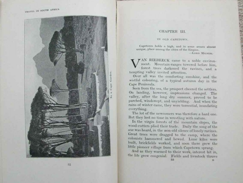 Travel in South Africa-Second Edition 1924. Title. Contents.Foreword. Map. Table of Notable South African Dates.Introduction. xxi plus 324 pages text with supporting black and white photographs.