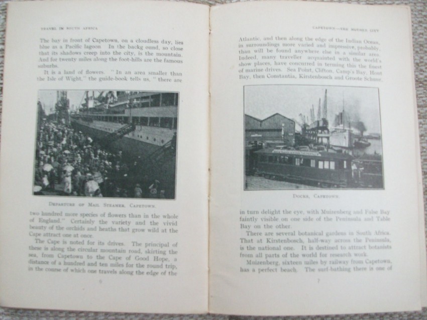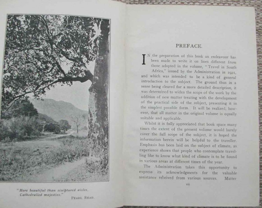 Travel in South Africa 1921 Edition. Title. Contents. Foreword. Map. Table of Notable South African Dates. Introduction. xx plus 306 pages text with supporting black and white photographs.