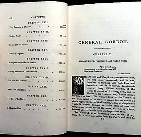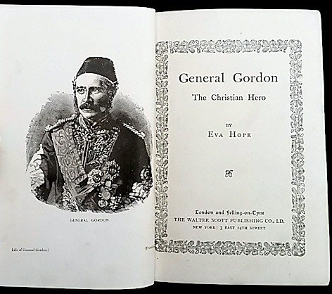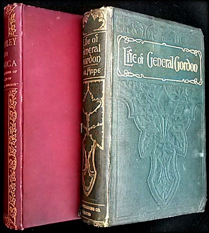 2)General Gordon - The Christian Hero; viii plus 369pp plus 16pp publisher ads. 191mm x 134mm x 30mm. Original green cloth with decorative gilt titles to spine and front cover. Blind embossed mural to front cover Frontispiece is present. Award presentation plaque to front free E.P.. Cloth is thread-bare on corners and cracked on spine hinges. Corners are bumped. Text-block is tight and remarkably clean throughout.