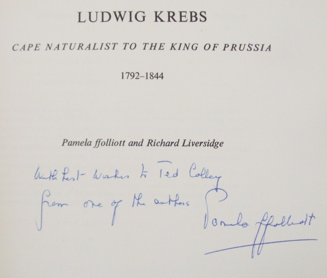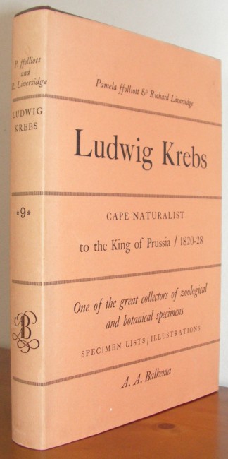 Presentation inscription from one of the authors on the title page. Small 4to; brown rexine-backed papered boards, with publisher's device in gilt to upper cover; dustwrapper; tinted top edge; pp. xiii + (iii) + 304, incl. index; plates in monochrome and full colour, incl. one folding; map. Dustwrapper very slightly rubbed, and a little sunned on spine panel; occasional fox spot. Near fine condition. "Ludwig Krebs, who travelled through the Eastern Cape in the first half of the nineteenth century, was one of the greatest collectors of botanical and zoological specimens who ever worked in South Africa. He made many new discoveries and several plants and animals bear his name. His work is well presented at the Zoological Museum of the Humboldt University in Berlin, and his name honoured among German naturalists. Yet, just because all his material went to Europe and so little remained here, his name and his work are virtually unknown in South Africa. He travelled through the Eastern Province when it was still almost virgin land and later met the first 1820-Settlers. Mainly from the letters he sent home and the notes in his scientific reports the authors have been able to build up the story of his life. It makes an important contribution to the history of naturalists and collectors in the Cape Colony. References made by Krebs to the many interesting people he met are followed by brief biographical sketches. The official lists of his collections, which contain a mass of scientific data, are included in the appendixes. ... The two authors, one an historian with two other books to her name, and the other a well-known ornithologist and museum director, have written a book that is interesting in its own right and also does full justice to Ludwig Krebs' scientific achievements."