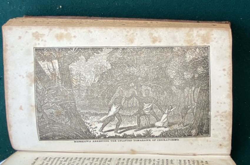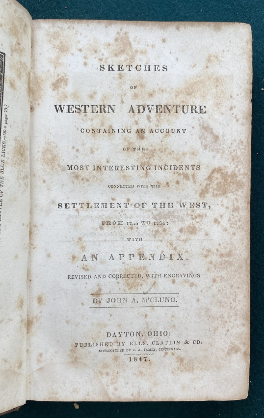 John A. M'LUNG. Sketches of western adventure: containing an account of the most interesting incidents connected with the settlement of the west, from 1755 to 1794: with an appendix. Revised and corrected, with engravings. Dayton, Ohio: Ells, Clafin & Co., 1847. Octavo (7 ¼ x 4 1/2in). Pp. [4] ads, [i]-viii, [9]- 315, [1] ads, with the wood-engraved frontispiece and 2 ‘plates’ being part of the pagination and the collation. (Spotting, occasionally heavy). Contemporary speckled sheep, the flat spine divided into five compartments by pairs of gilt rules, red leather label in the second compartment. (Worn, splits to joints, the upper cover almost detached, extremities rubbed, covers somewhat bowed, free endpapers lacking). A later printing of a work which Howes called "One of the best and most popular collections” of Indian adventures and captivities along the border. Thompson goes further, describing it as "the most complete collection of captivities and early adventures ever published in one volume." First published in Maysville, Ky., in 1832, this work went through 13 printings by 1879. This 1847 edition has an appendix and was revised and corrected. See Howes M-46; see Jillson, Rare Kentucky Books, p. 89; see Sabin 43052; Thomson 745; see Vaughan 191; see Ayer 189; see Coleman 2221.
