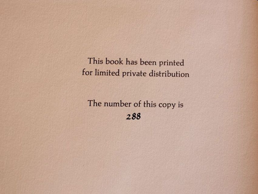 Printed for limited private distribution. Hand-numbered, this being #288. Signed by the author on the title page.