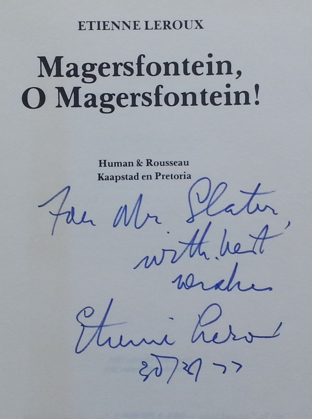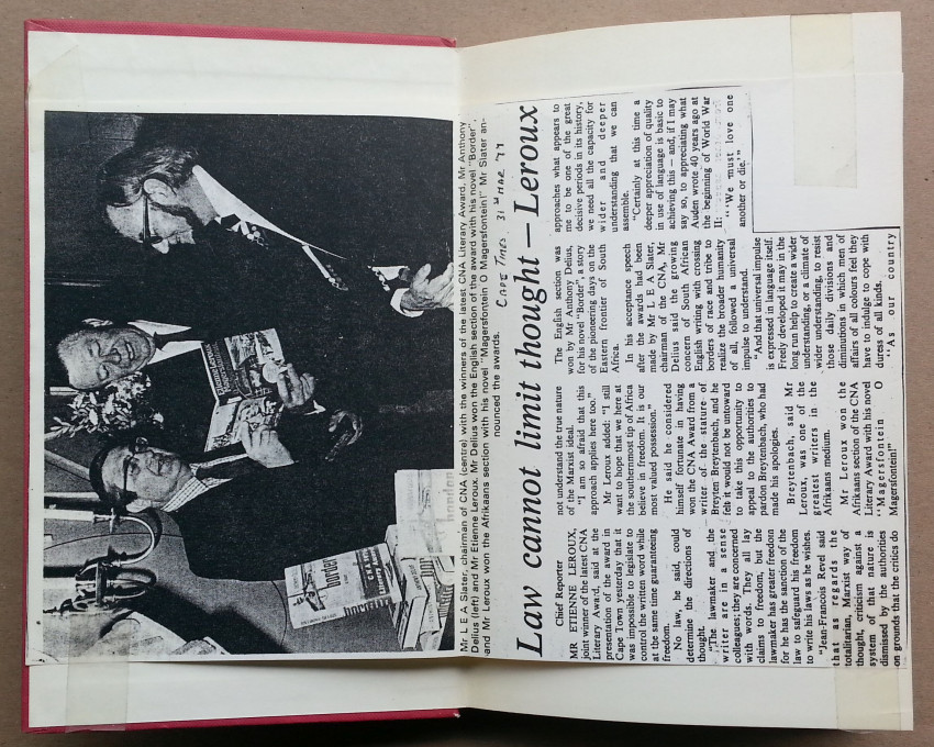 Inscribed by author to L. E. A. Slater, chairman of the CNA. Inscribed at the award ceremony when author received the CNA prize.