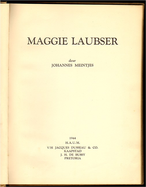 Published by H.A.U.M.,V/H Jacques Dusseau & Co. Kaapstad. J.H. de Bussy, Pretoria.