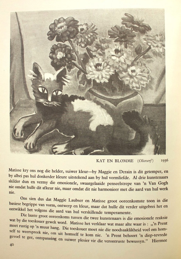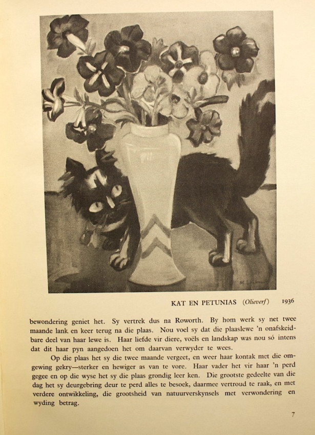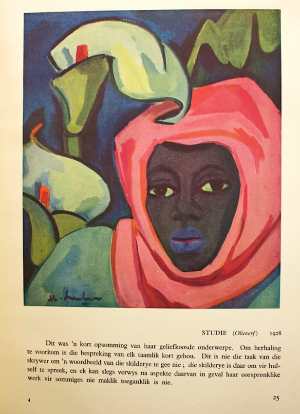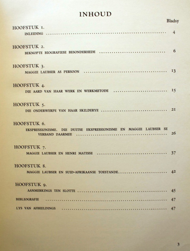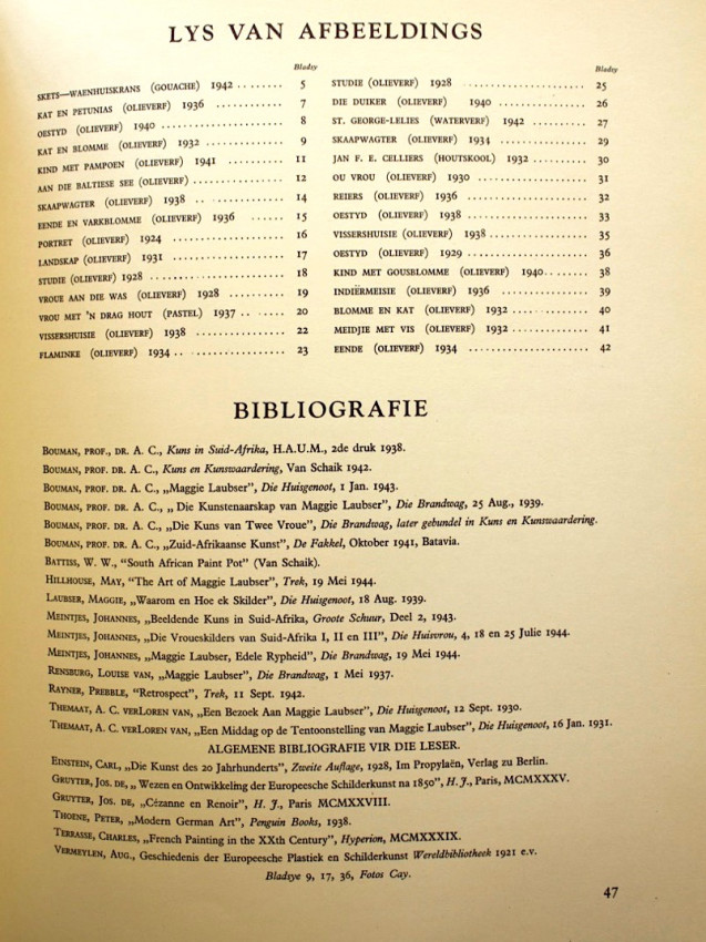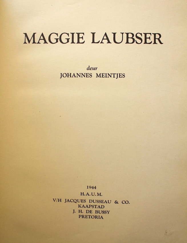 After an exhibition of Laubser's work in 1940, a then seventeen year old Johannes Meintjes wrote a letter of admiration to the artist. A strong friendship developed with the result that Meintjes wrote this monography on the artist when he was only twenty one years old. This was the very first book written by Meintjes, who was to become a most prolific author of biographies, plays and novels. Apart from his writing Meintjes was also one of South Africa's most distinguished and renowned artists, who, barely in his twenties, was already exhibiting together with the likes of Gérard Sekoto, Jean Welz, Maud Sumner, Walter Battiss, Cecil Higgs, Gregoire Boonzaier, and of course his great inspiration, Maggie Laubser.