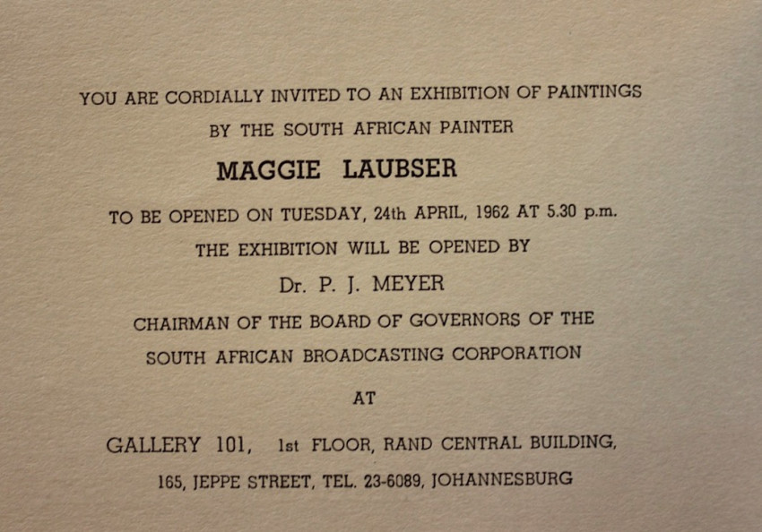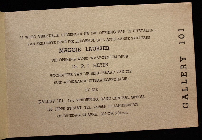 An extremely scarce, and possibly unique, invitation card to the opening of one of Laubser's art exhibitions, held at Gallery 101 in Johannesburg, on the 24th of April 1962.