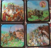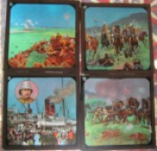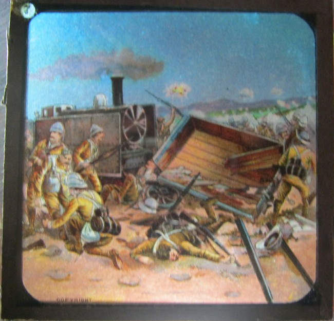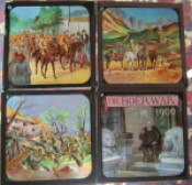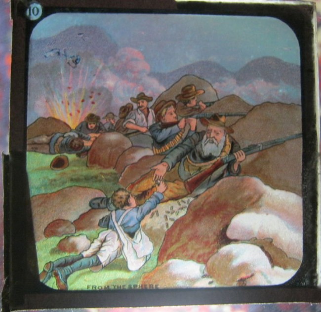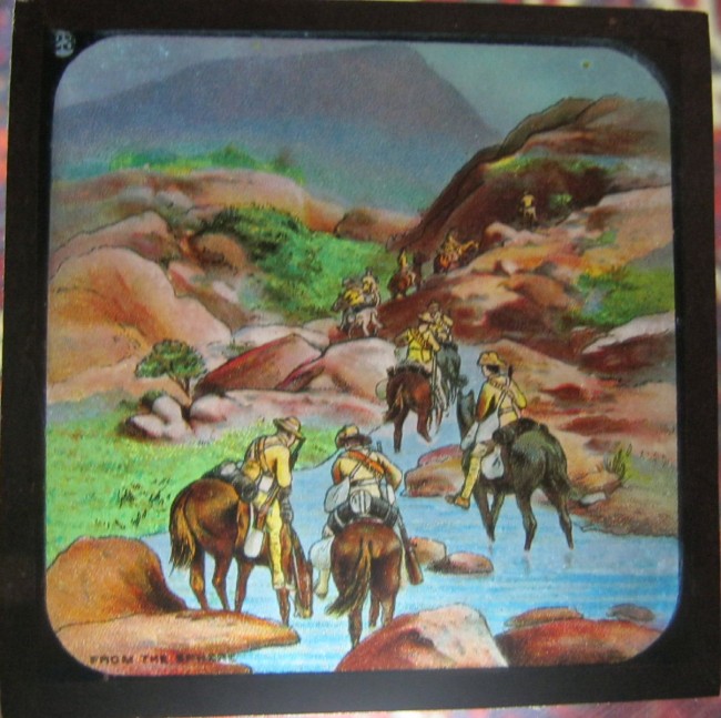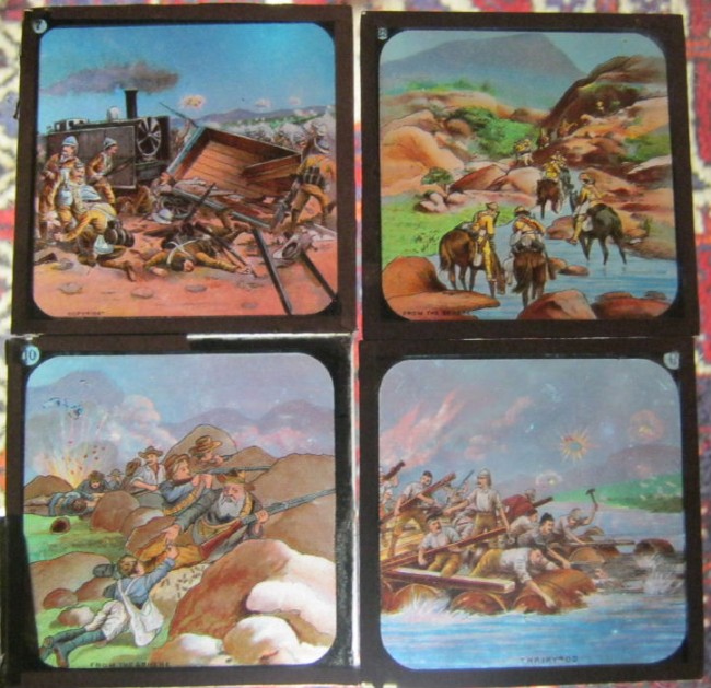 The Boer War. Colour Lantern Slides of 1900. Chapters #1 - #4. Glass slides, with colour pictures of scenes from the Anglo-Boer War up to the entrance of the British Army into Bloemfontein. The images first appeared in “The Sphere” weekly magazine (in black & white) & were coloured specially for the slides. 30 of 32 slides, (size: approx. 82 mm x 82 mm), missing nos. #18 “Belmont” & #25 “Lord Roberts.” The slides are numbered top left. 30 beautiful colour slides showing important & famous incidents, including troops trekking, engagements, scouting, battles & the like.