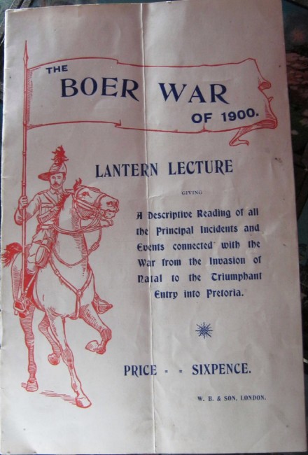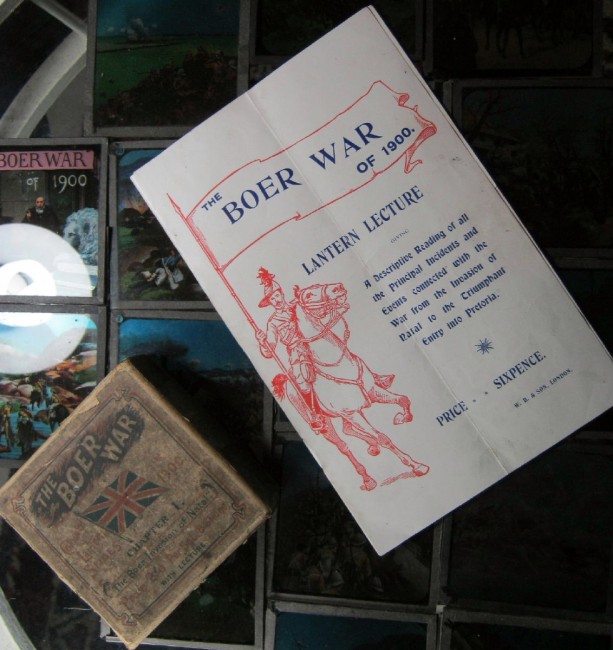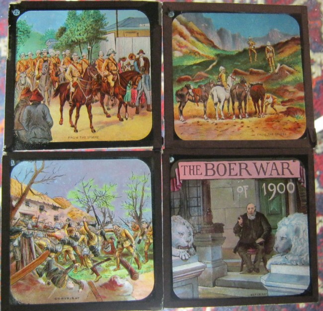 Included in this lot is a booklet The Boer War of 1900. Lantern Lecture giving a descriptive reading of all the principal incidents and events connected with the War from the Invasion of Natal to the Triumphant Entry into Pretoria. London, W.B[utcher] & Son, (c. 1900). 8vo. Printer wrappers. Pp. 12. Contains descriptions of all 40 slides, chapter-by-chapter, each slide described, with title & details of the picture. A properly printed & published pamphlet, this booklet is seldom found with the slides & is very scarce indeed.