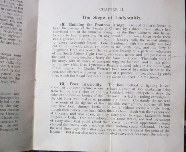 Chapter 1 - The Boer Invasion of Natal. Chapter 2 - The Siege of Ladysmith. Chapter 3 - The Relief of Kimberley. Chapter 4 - Surrender of Cronje & Occupation of Bloemfontein. Chapter 5 - Relief of Mafeking and entry into Pretoria (Not present) There is no viewer present, but a bright light shows the slides off well & they are very clear (see our photographic images). A fifth chapter containing slides #33 - #40, taking the War up to Pretoria, is not present.