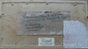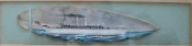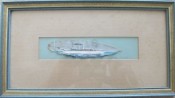 A framed mounted painted feather with the RSM SCOT, two funnels and white livery and flag steaming on choppy sea. With inscription to rear of mount ' In remembrance of your first visit on board the SCOT- Saturday Feb.2nd. 1895. With a further typed text of data of the SCOT and her performances.