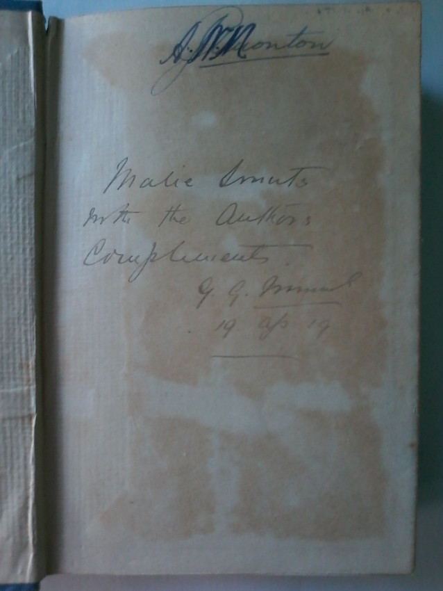 Signed by Senator The Hon. G. G. Munnik " With complements to Malie Smuts. " in 1919.