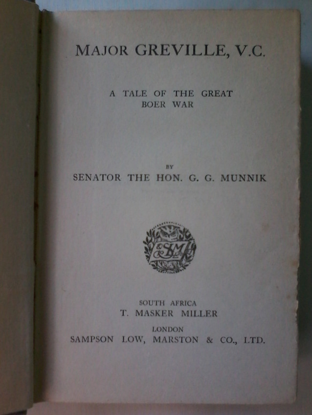 Major Greville, V. C., A TALE OF THE GREAT BOER WAR by Senator The Hon. G. G. Munnik, Published by Maskew Miller/ Sampson Low, Marston & Co. LTD, London 1911, Signed by the Author.