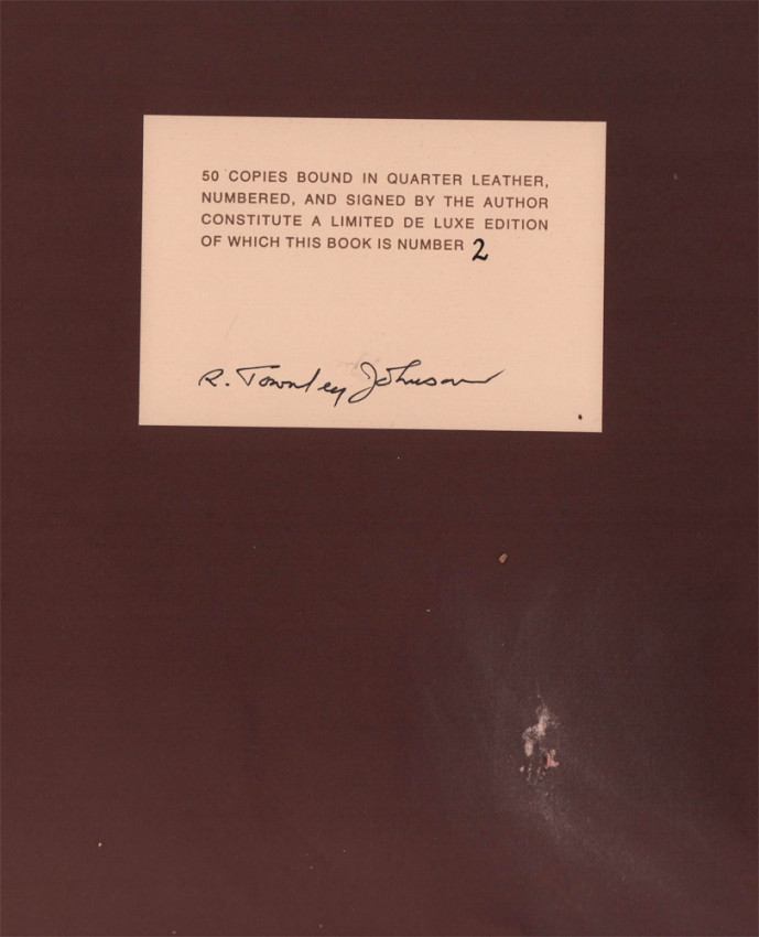 The limitation tipped in on the front free end paper reads: 50 copies bound in quarter leather, numbered and signed by the author constitute a limited de luxe edition of which this book is number 2.
