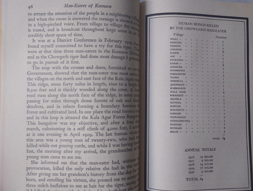 Corbett's narrative of his hunting expeditions in the Himalayas. The author writes that he hunted tigers on behalf of villages and rural Indian citizens who were hunted by the big cats.