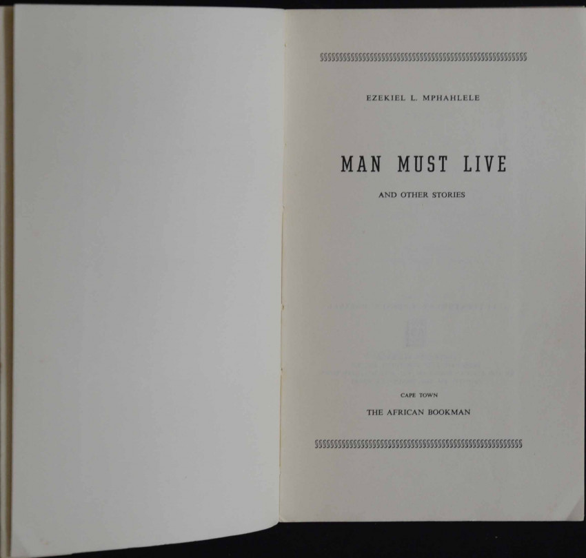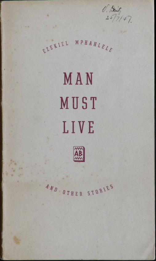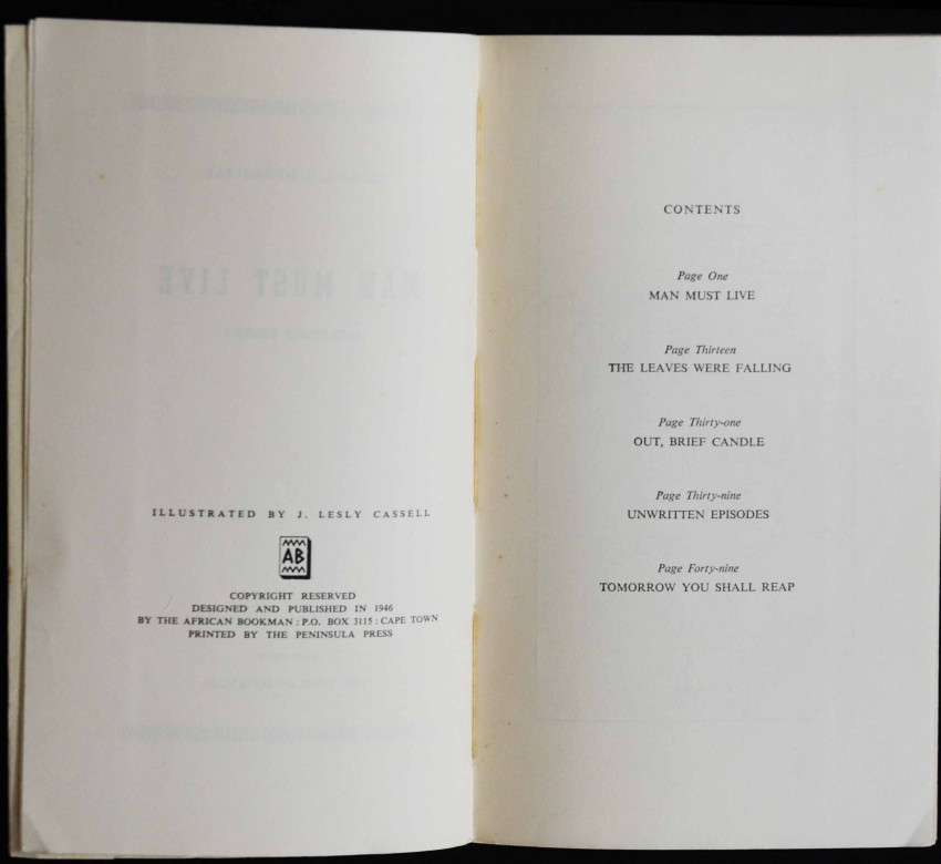 This is a small fragile 60pp. booklet comprising 5 short stories. It is one of only 700 copies printed (Ref: The author's autobiography "Down Second Avenue") and seldom appears on the market. The following extract from a letter the author wrote to a book dealer in 1973 bears testament to its' scarcity: 'If one day A MAN MUST LIVE & OTHER STORIES - my first book of stories - Cape Town - African Bookman - turns up please let me buy it'. And this was 40 years ago! (This letter is currently on offer online).
