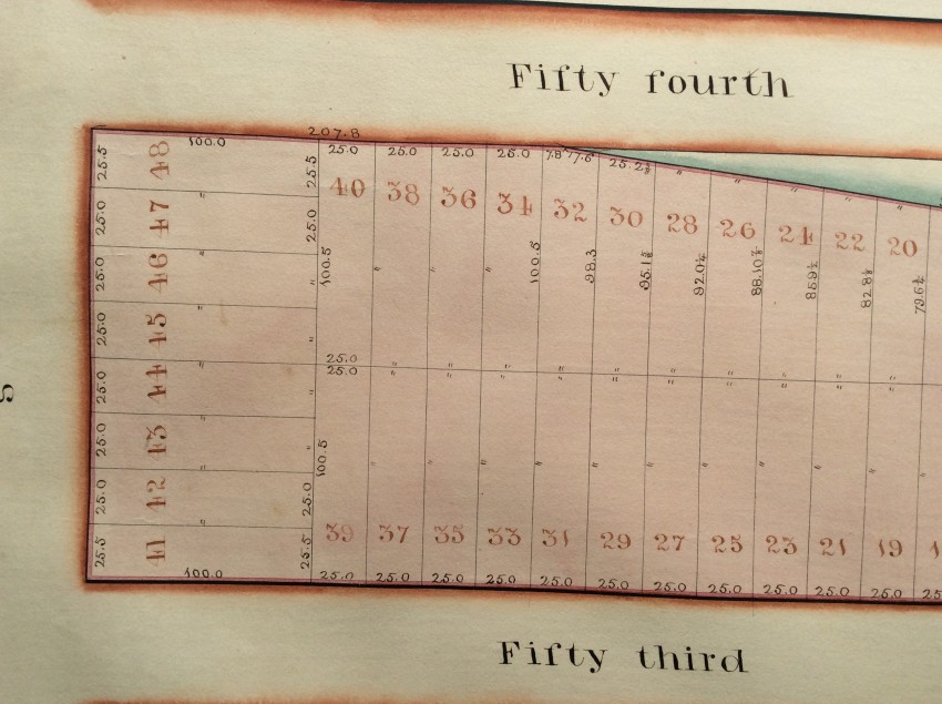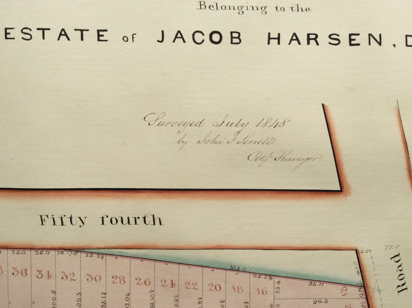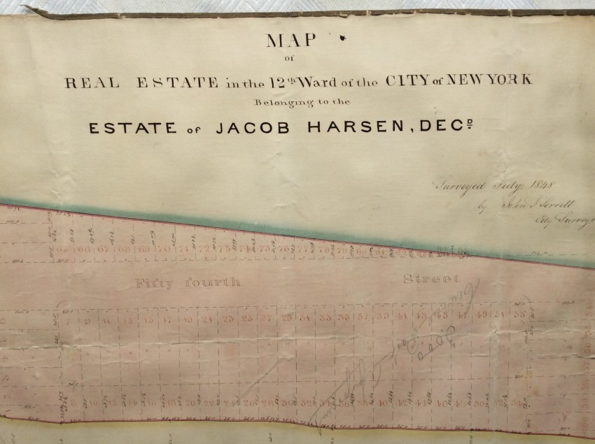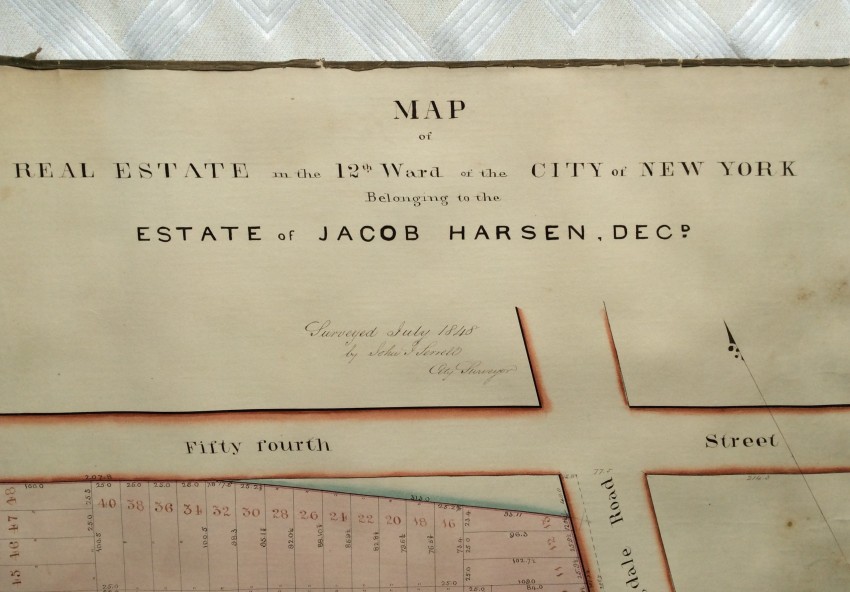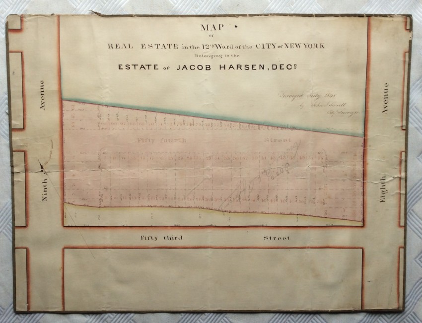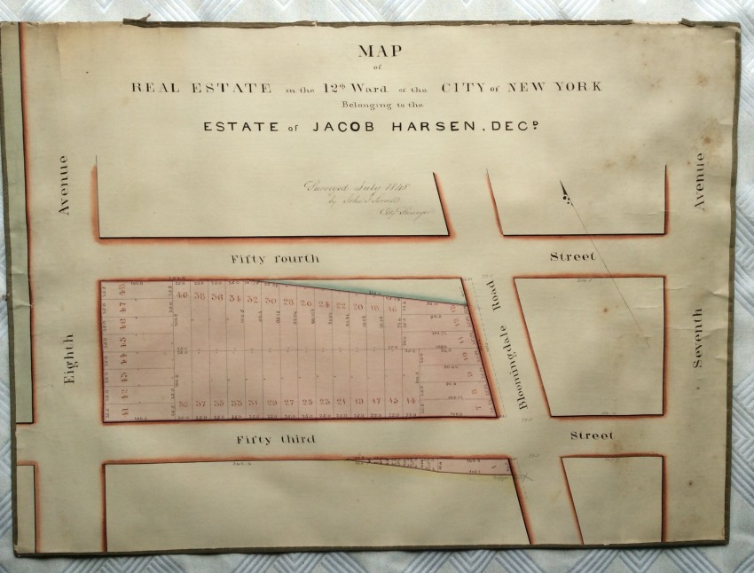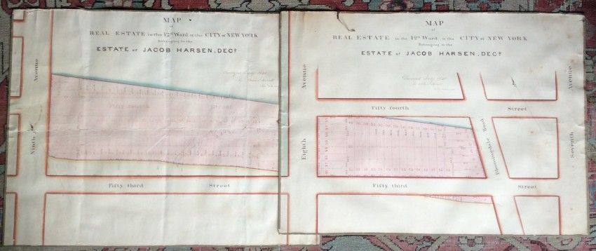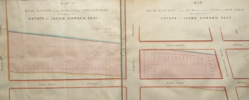 The present maps represent one of Jacob Harsen's subsidiary holdings, and cover an area that now includes the the Midtown North Police Precinct building, the Midtown Community Court , as well as Studio 54 and the Ed Sullivan Theater (the home of 'The Late Show' with Stephen Colbert).